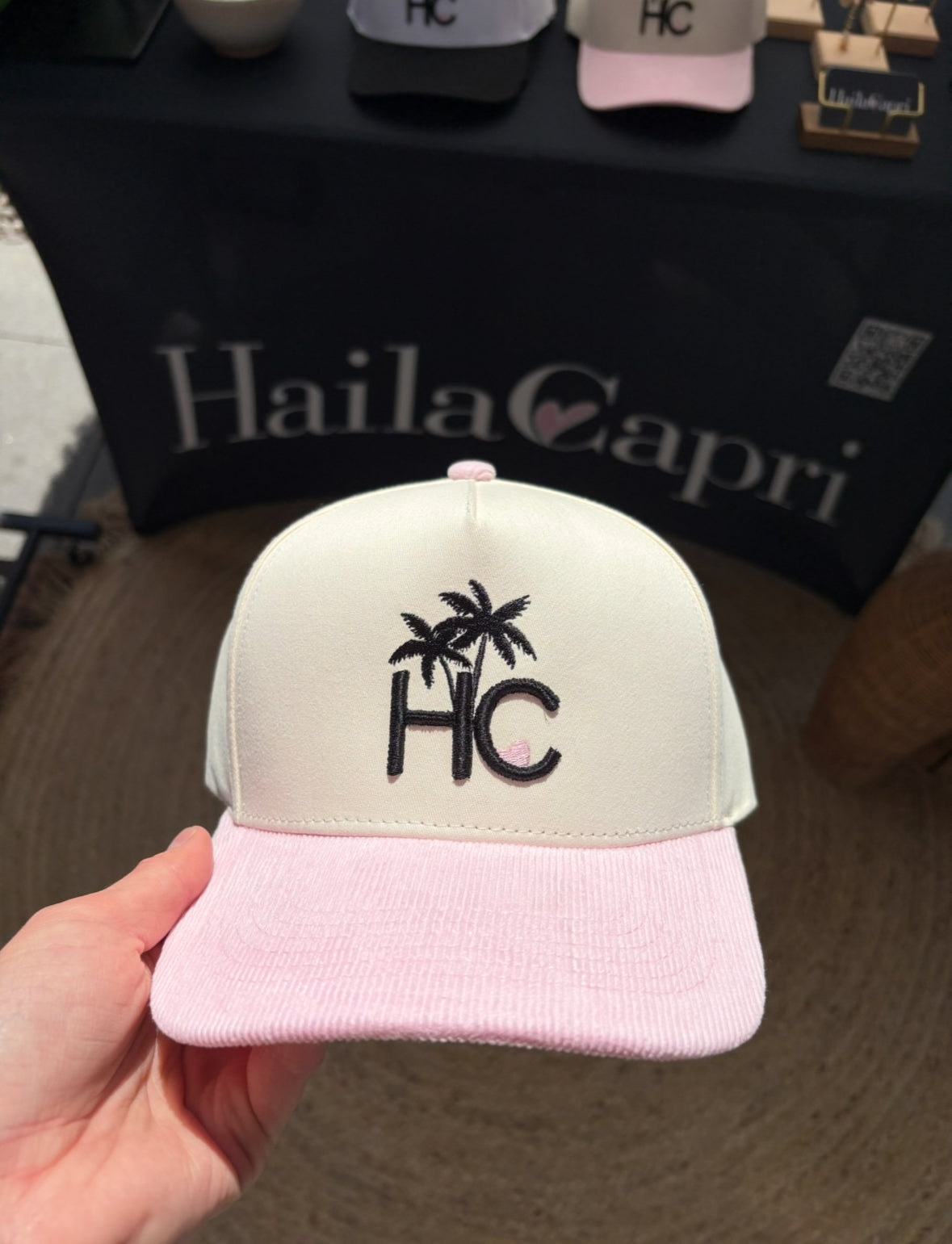 Pink/White canvas hat with corduroy texture, pre-curved bill, adjustable buckle closure
